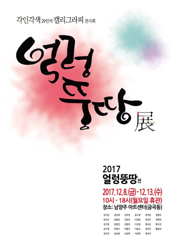 캘리그라피 전시회 안내 [얼렁뚱땅전] 페이지 정보 작성자 최고관리자 작성일18-01-02 17:19 조회7,821회 댓글0건 관련링크 이전글 다음글 목록 본문 캘리그라피 전시회 안내 [얼렁뚱땅전] 일 시 : 2017. 12. 8. (금) ~ 12. 13. (수) 10시 ~ 18시(월요일 휴관) 장 소 : 남양주 아트센터(금곡동) 댓글목록 등록된 댓글이 없습니다. 이전글 다음글 목록